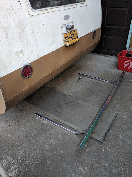 Ok, back to painting the trailer. The green tape is just to sort out ideas. Clearly some prep work needed to be done to the old paint...Check out the bumper Fred made out of a log! He drilled the inside to run electricity to the side running lights, and a LED rope light that runs along the whole thing for a back up light. You can see the wood grain beneath the thick silver paint. It's quite wonderful!